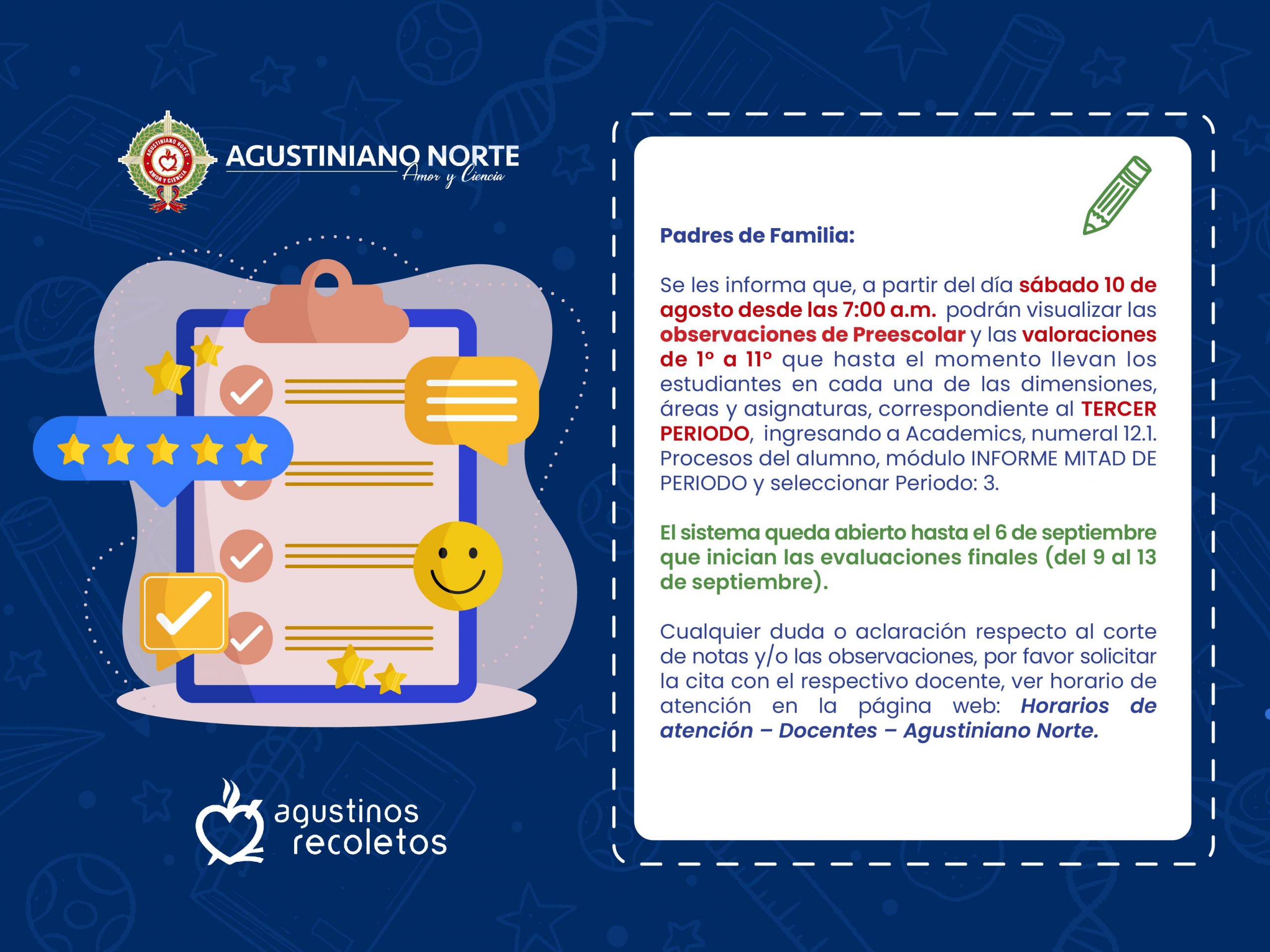 Viernes 13 de septiembre del 2024 Padres de Familia, reciban un cordial saludo Informamos que las evaluaciones extemporáneas correspondientes al Tercer Periodo; se realizarán el 16 de septiembre para aquellos estudiantes que no presentaron evaluaciones finales. Por favor consultar el cronograma, hacer el repaso respectivo y solicitarle …