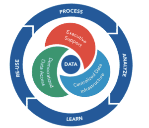 Según un artículo de Harvard Business Review escrito por ejecutivos de McKinsey, ser una empresa basada en datos requiere emprender simultáneamente tres iniciativas interdependientes